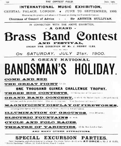 In 1900 John Henry Iles obtained the co-operation of the Crystal Palace Company to present and organise the National Brass Band Championships of Great Britain, together with the complementary Festival Concert. Agreement was reached to use the Challenge Trophy for the overall winning band and it was removed from "moth-balls" where it had languished for twenty-seven years.